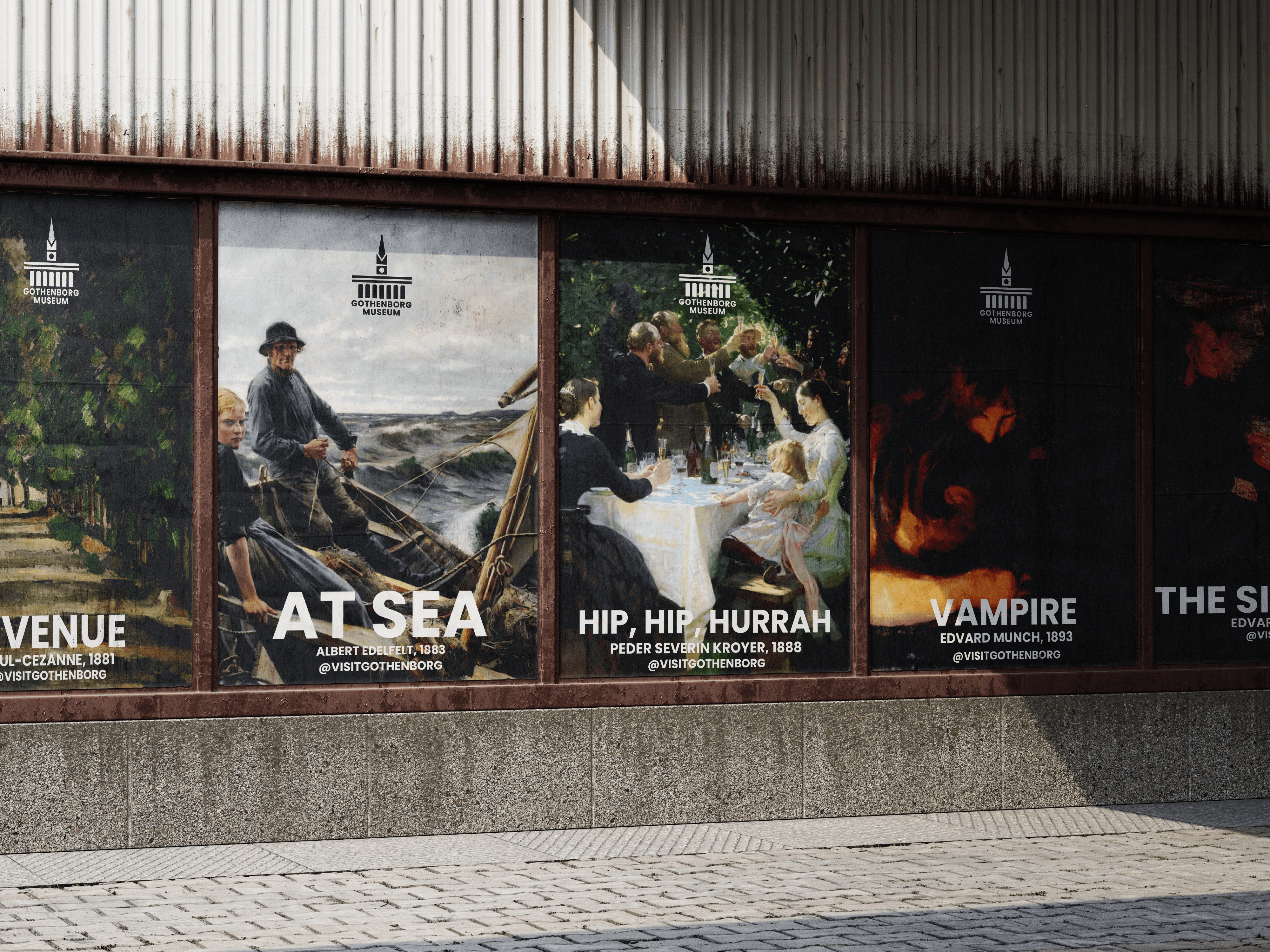 In a busy urban environment, a museum poster competes with high-contrast fashion ads, movie releases, and digital noise. A polite image of a painting with small text gets lost. By blowing up Hip, Hip, Hurrah! or Vampire to billboard scale and stamping them with bold, white text, I borrowed the visual language of blockbuster cinema. This approach commands the same attention as a film premiere, signaling to the passerby that this exhibition is an event, not just a display.